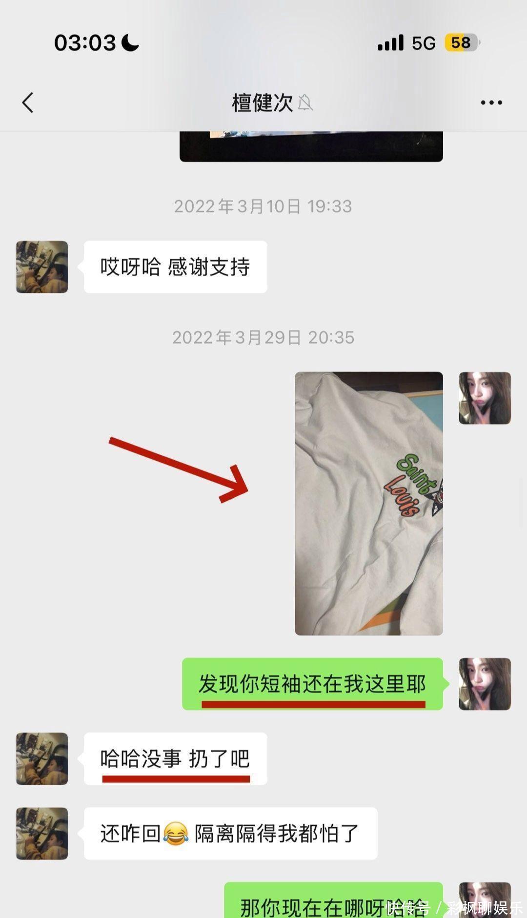 为了证明这段交情的确切,她干脆晒出对方疑似落在她家的衣服,还指出对方头像和常用表情,完全跟檀健次私下朋友圈的那些细节对得上号。